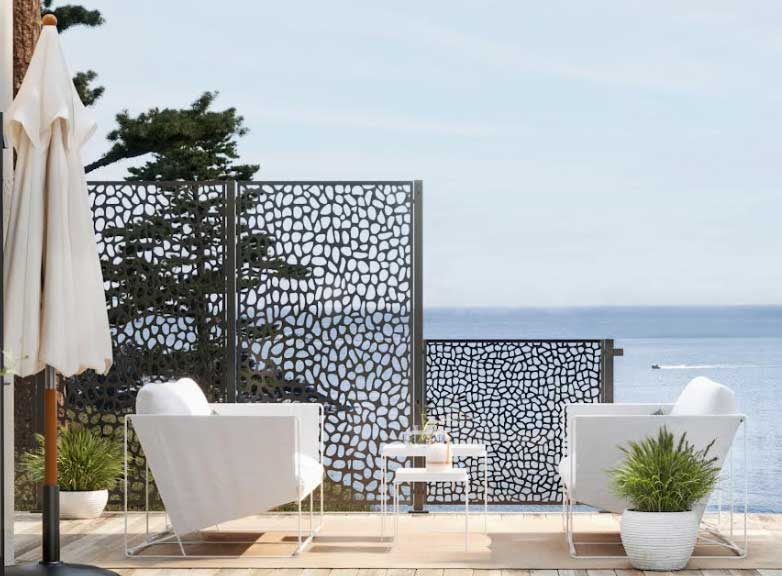 Perinteiset aidat ja umpinaiset tuulensuojat voivat sulkea tilan. Elements tuo keveyttä ja läpinäkyvyyttä samalla, kun se rajoittaa näkyvyyttä ja vaimentaa tuulta. Laserleikatuista kuvioista pääsee valo läpi, mikä luo miellyttävän tunnelman esimerkiksi:
