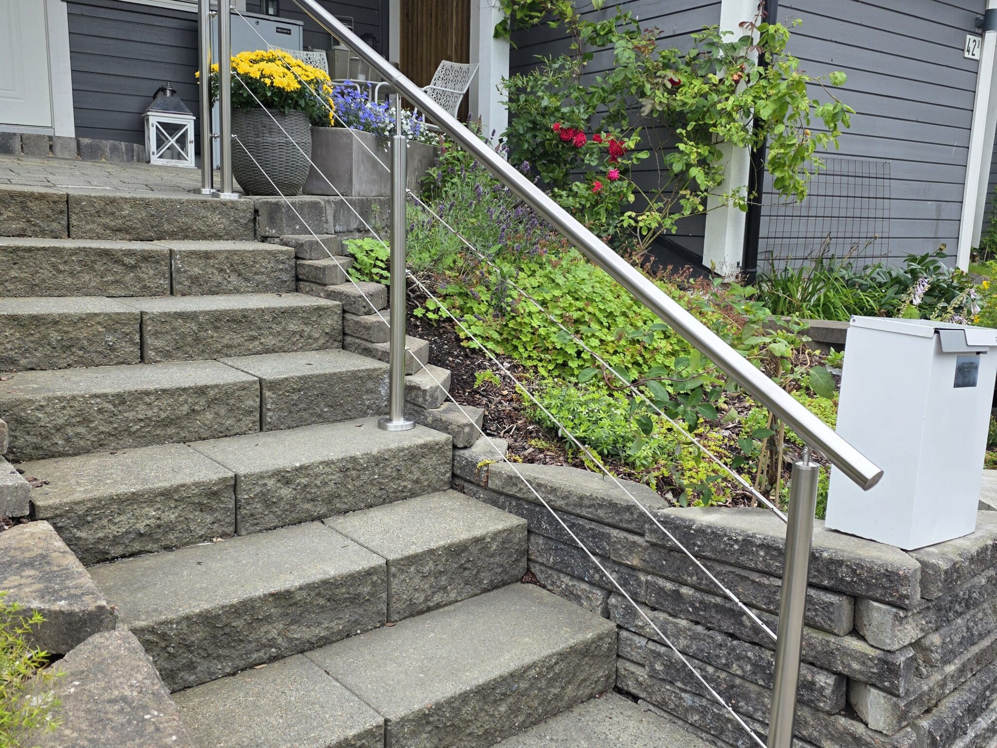 Lähetämme tilauksen mukana kaiken, mitä tarvitset (mukaan luettuna ruuvit ja terät), jotta kaide olisi mahdollisimman helppo asentaa. Ruostumattomasta teräksestä valmistetuissa kaiteissamme tangoilla on tolpat jaloilla, jotka kiinnitetään alustan päälle. Tutustu mittamalleihimme saadaksesi tietoa siitä, kuinka tolpat tulee sijoittaa kulmiin ja loppuun. Kun olet tilannut kaiteesi, saat myös asennusohjeet sekä tekstinä että videona. Ne kattavat kaikki vaiheet, jotka tulet käymään läpi kaidetta asentaessasi.