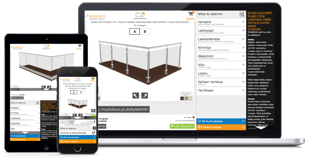 Interaktiivisella suunnittelutyökalullamme voit muokata jokaisen yksityiskohdan ja nähdä hinnan reaaliajassa. Katsele suunnitelmaasi 3D-muodossa, säädä mittoja ja vertaile eri ratkaisuja ennen tilaamista.